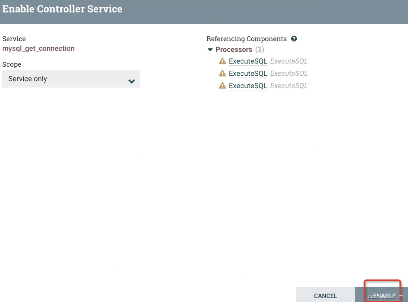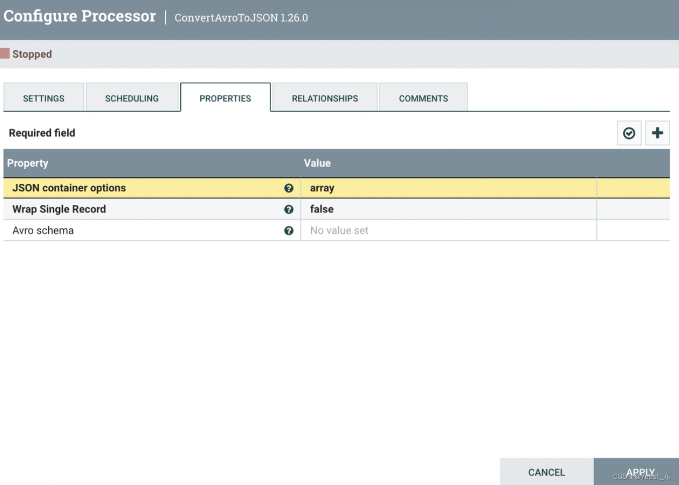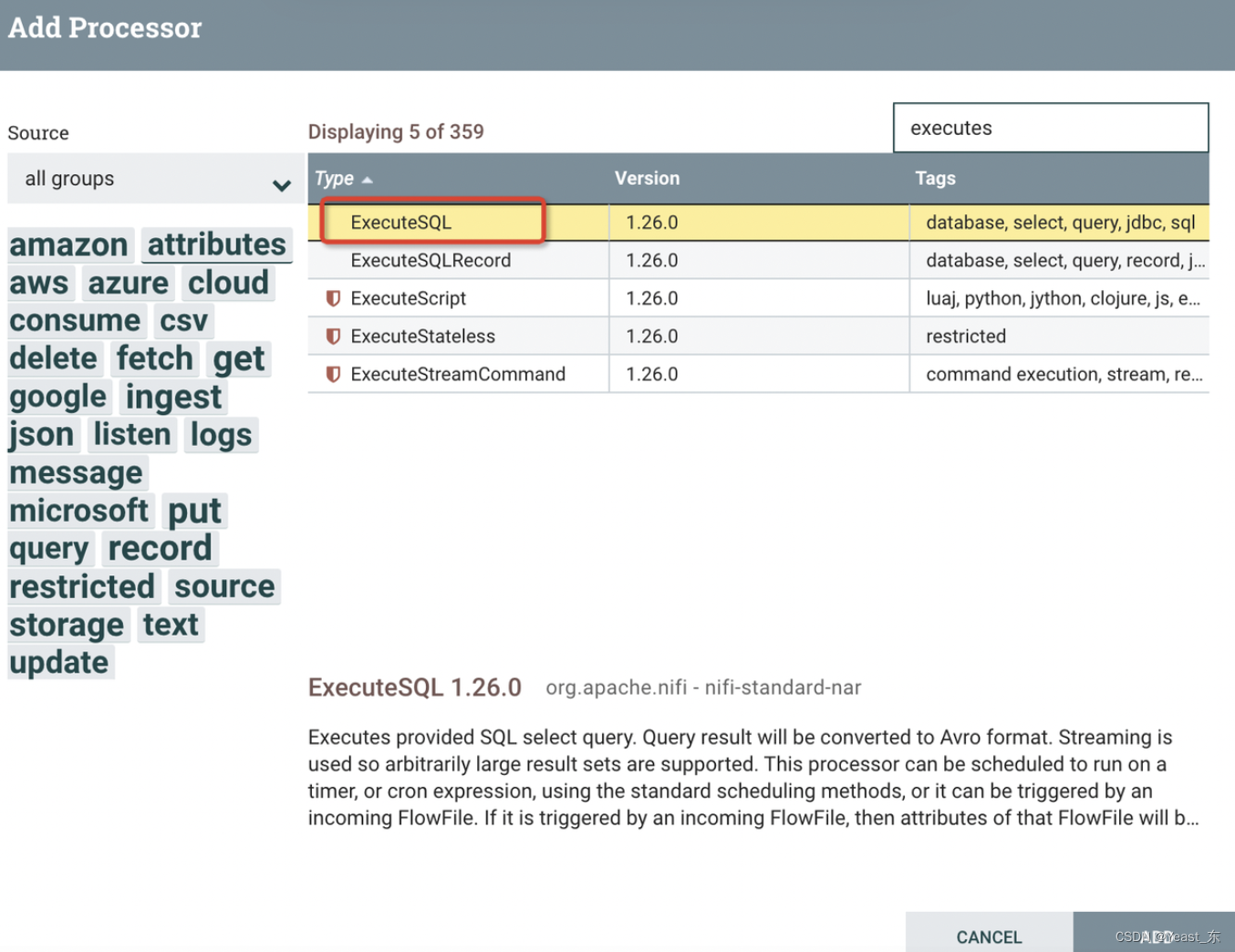 点击工具栏处的Processor,拖拽到工作区,搜索处理器ConvertAvroToJSON,因为在第一步中,我们通过sql查询到的数据为Avro格式,所以在这里需要转化为json在进行输出