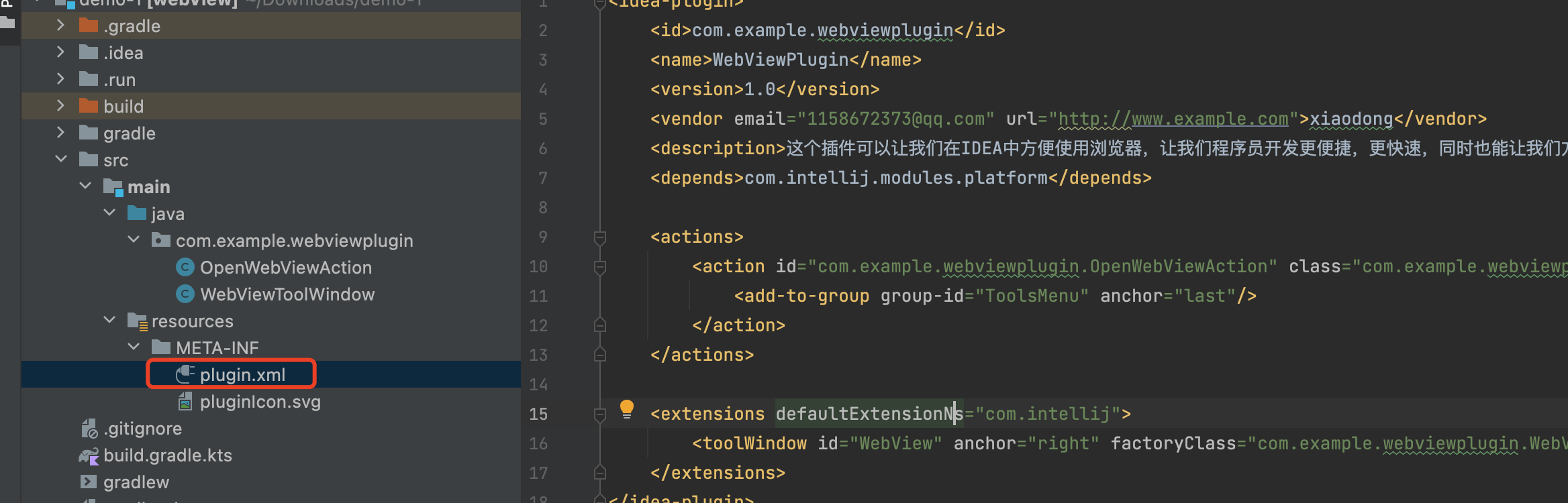 <action id="com.example.webviewplugin.OpenWebViewAction" class="com.example.webviewplugin.OpenWebViewAction" text="Open xiaodong's WebView" description="Open a WebView in a ToolWindow">