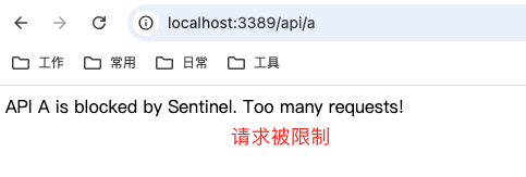 http://localhost:8080/api/a和http://localhost:8080/api/b快速刷新页面,当超过限流阈值时会看到限流提示信息(如下图)